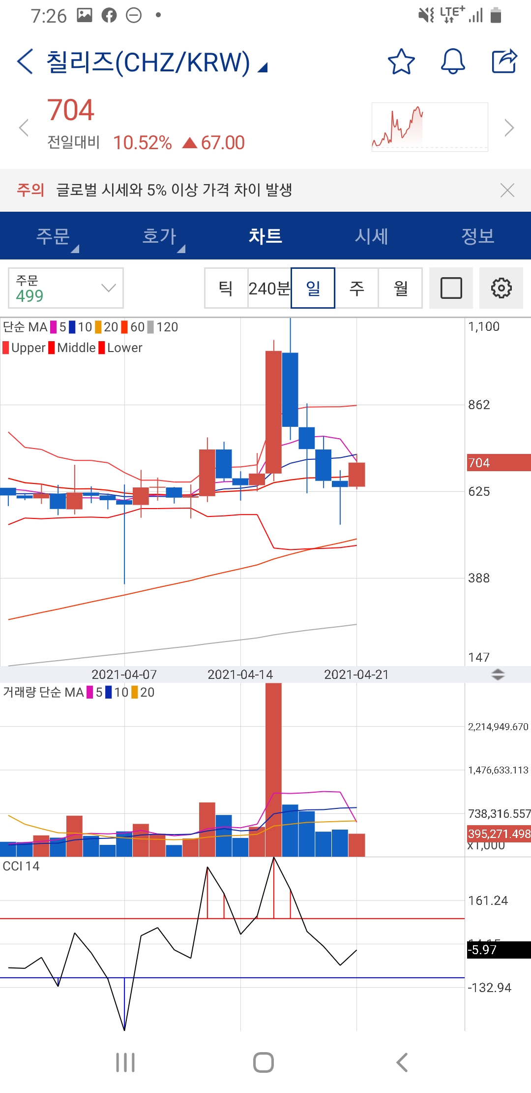 자 본론은, 제가 말하는 방법은 유튜브에서 알아낸 방법이고, 저는 이 방법에 맞는 차트를 찾다가 칠리즈라는 코인을 사서 수익을 봤었습니다. 어렵지 않아요. 이용할 지표는 일봉, CCI, 볼린저밴드입니다. 일봉 차트를 켜고 지표 검색창에서 볼린저밴드, CCI를 켭니다.